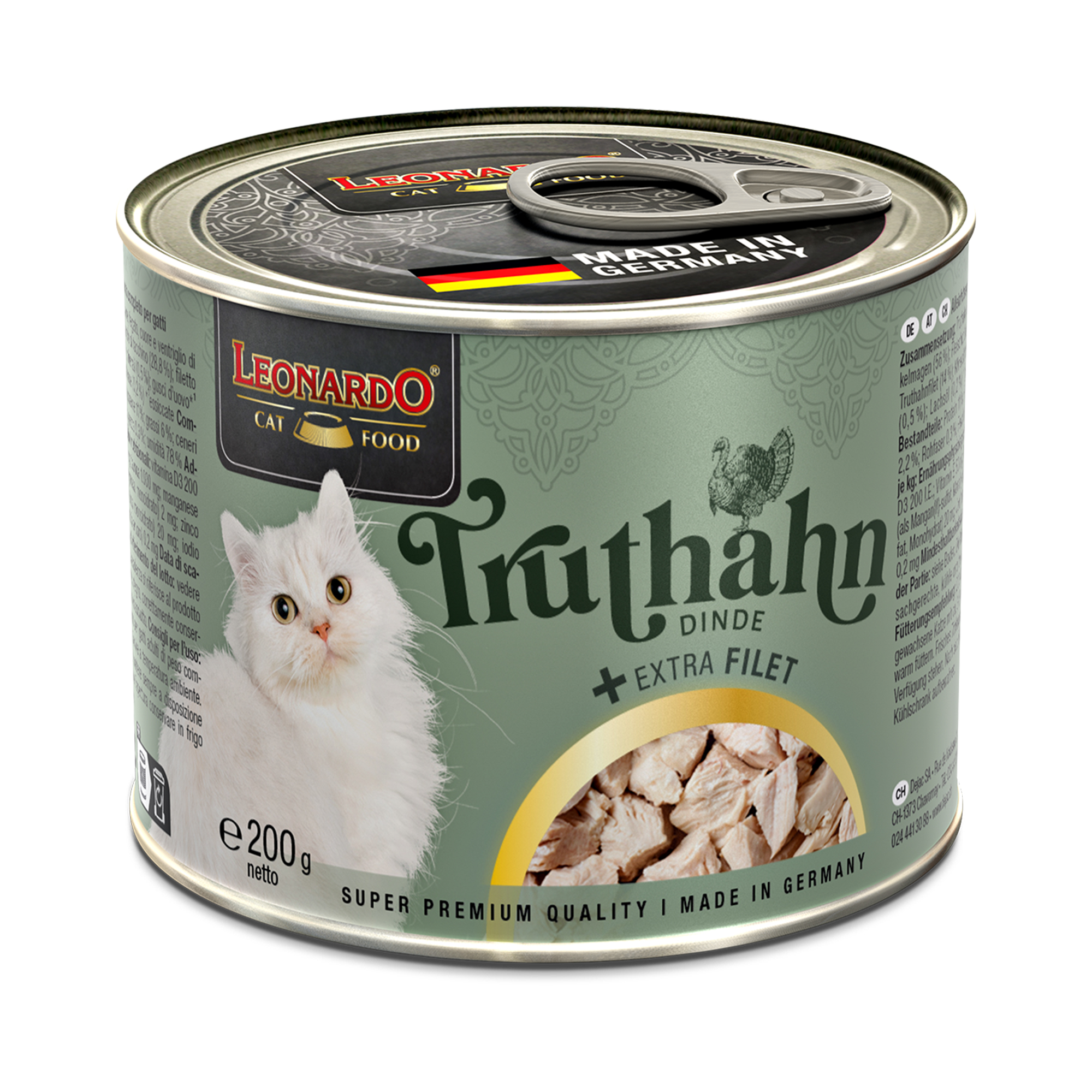 La haute teneur en viande de dinde de qualité supérieure est affinnée avec des morceaux de filet extra savoureux. Cuite délicatement dans son propre jus, la viande devient ainsi un plaisir irrésistible avec une sensation de mastication irrésistible. Une huile des saumon des plus délicate donne la note finale aux recettes et fournit des acides gras polyinsaturés pour un poil soyeux. Naturellement sans sucre ni colorants, arômes ou conservateurs artificiels.